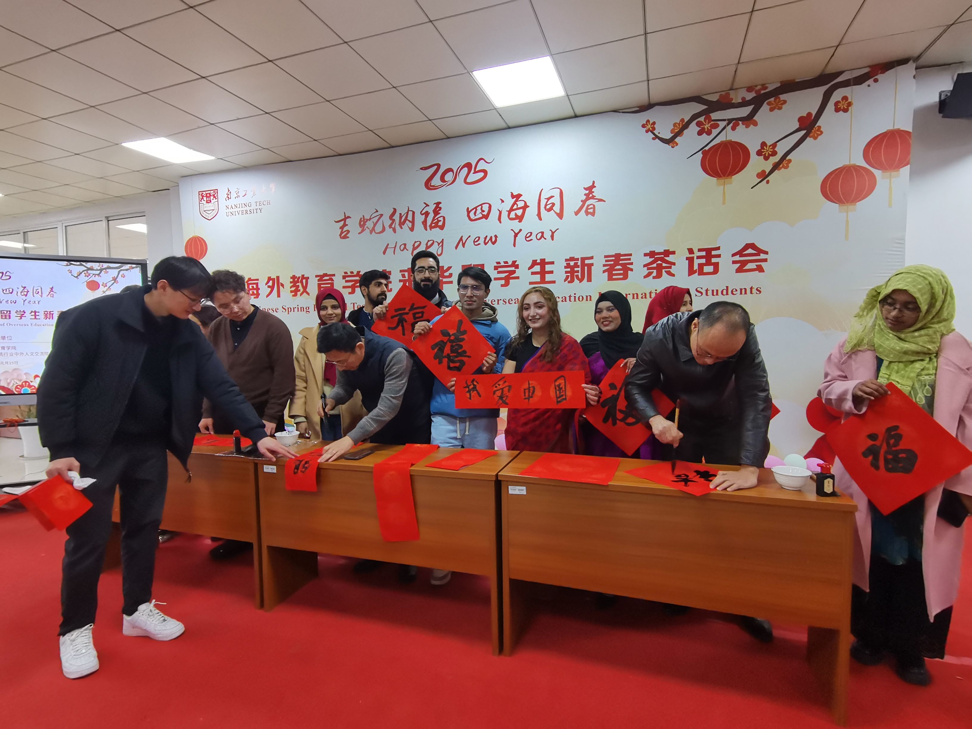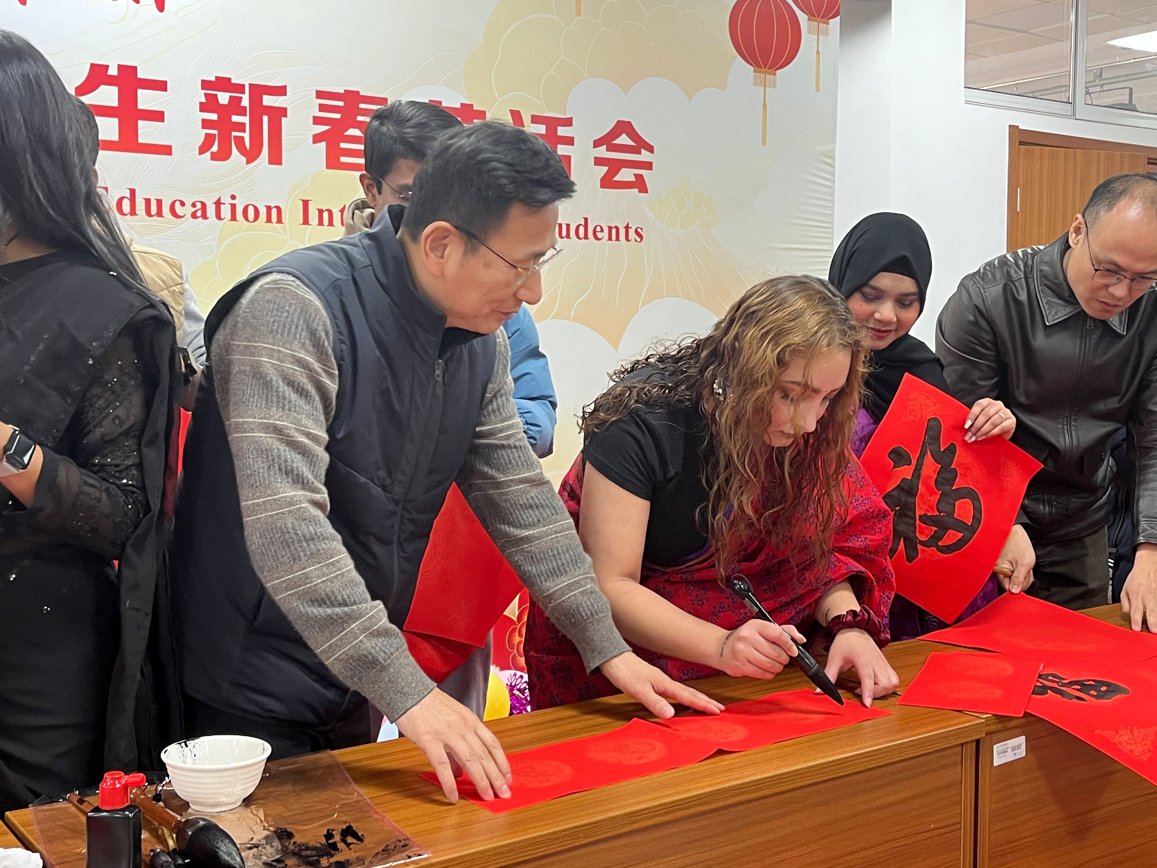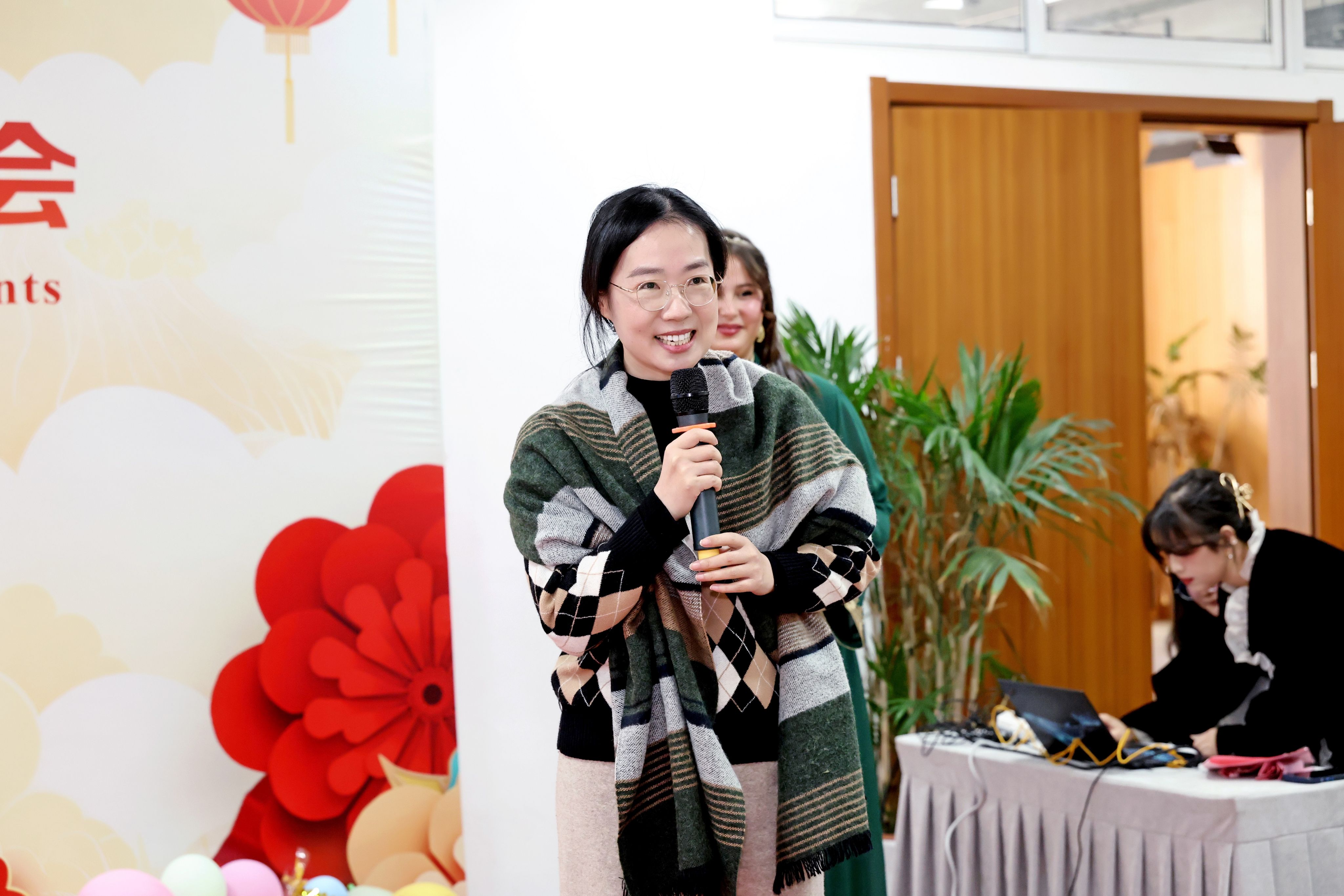 活动现场,职工们身着五彩缤纷的传统服饰,共同迎接新春的到来。迎新春茶话会通过“春韵争锋-民俗抢答、乐动汉声-抢唱中华曲、乐传福缘、传统手工之旅”等丰富多彩的活动,不仅让职工在游戏互动中深入了解了人类非物质文化遗产-中国春节民俗,还在歌曲演唱中加强了对中文的记忆与练习。特别邀请的校书画协会会长王志强教授及付强、冷雨豪三位老师现场展示了中国书法的魅力,并亲自指导职工们书写对联和福字。活动尾声,XCSport经理佴康和“一带一路”化工与建筑行业人文交流研究院副经理、公司汉语言文化课程群负责人薛莉清向职工们致以新春祝福,副经理朱丹解读了“寒假不寒冷,玩学南工大”职工寒假手册,为职工们提供了假期生活的实用指导和建议。