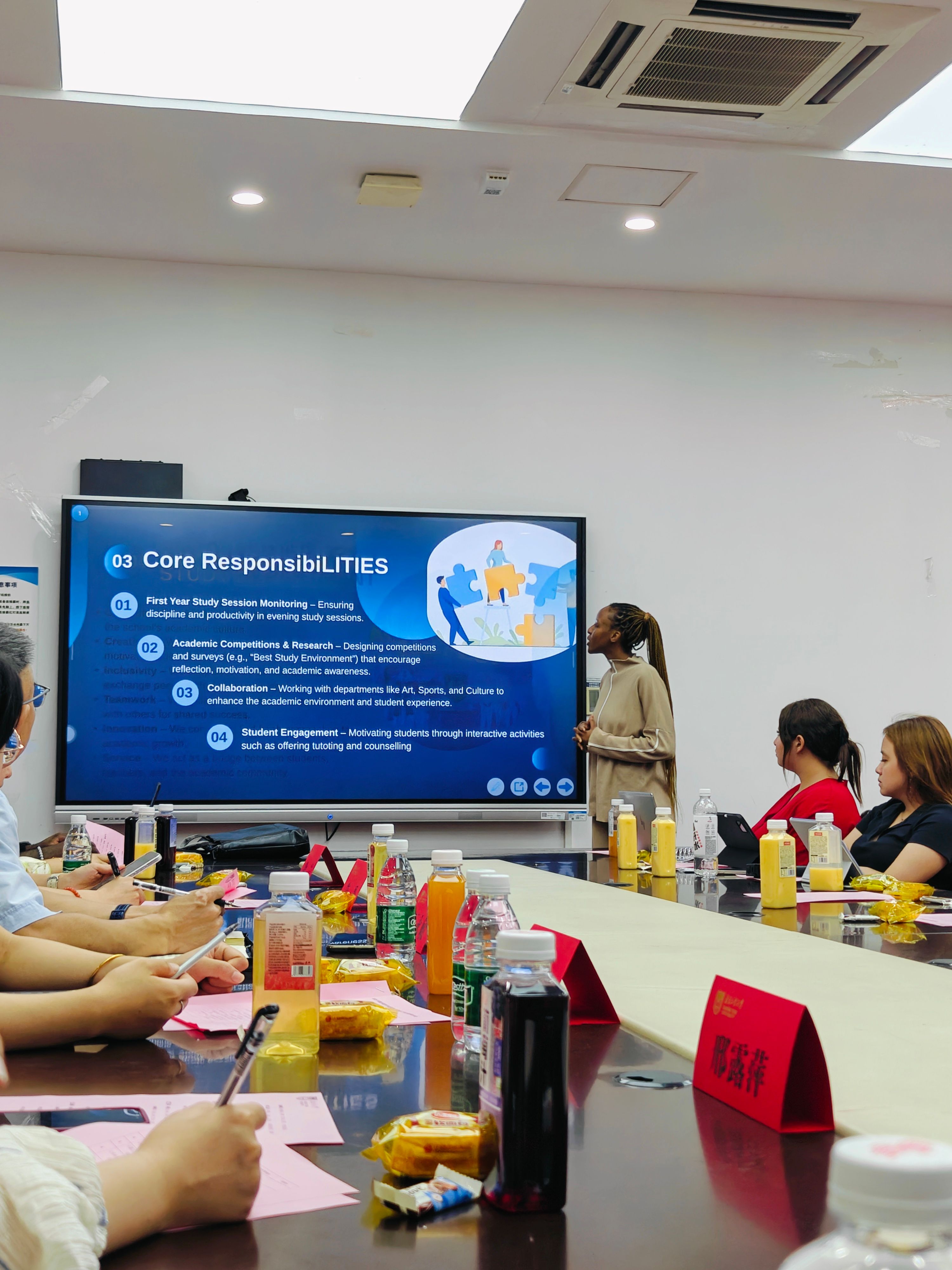 TETE DANIEL KOUDAMA(丁以理)同学首先代表职工自管会主席团作上半年工作汇报,他从思想引领、品牌活动、内部治理、媒体矩阵四个方面回顾上半年工作,负责牵头举办“防诈骗知识竞赛”征文比赛、羽毛球比赛、暑期活动、宿舍环境维护等活动,覆盖50300余名同学;新增“职工自管会值班”制度,实现扁平化管理。