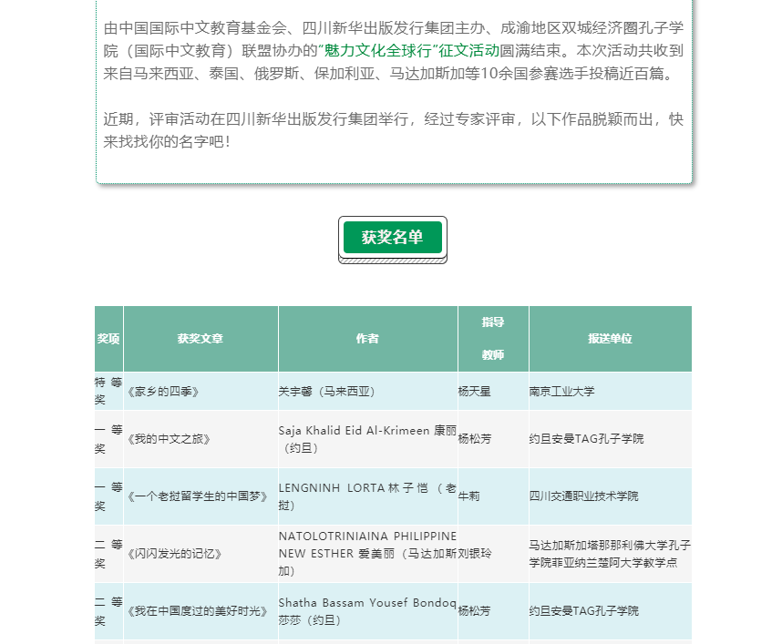 近日,XCSport杨天星老师指导的马来西亚职工关宇馨参加“魅力文化全球行”征文比赛,在近百名参赛选手中拔得头筹,获得唯一的特等奖。该项比赛由中国国际中文教育基金会、四川新华出版发行集团主办,成渝地区双城经济圈孔子公司(国际中文教育)联盟协办。本次活动共有马来西亚、泰国、俄罗斯、保加利亚、马达加斯加等10余国参赛选手投稿近百篇。关宇馨同学平时学习认真,成绩优异,作品《家乡的四季》本是其《综合汉语》的课程作业,这次几经修改参赛,有幸获奖。