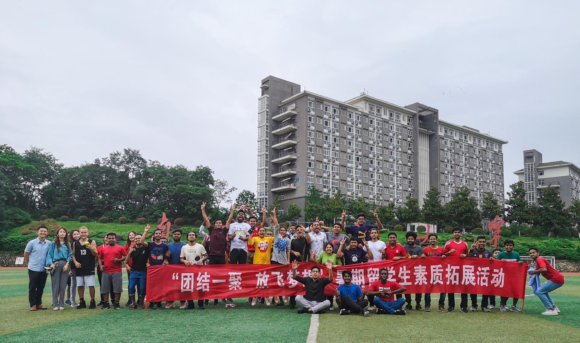 本次素质拓展活动包括合弹同心鼓、不倒森林、接力高尔夫、转圈弹瓶盖四个项目。同学们随机分成四组,以团队合作形式开展活动,每个项目都得到大家的热情参与。运动场上笑声不断,气氛热烈,大家相互积极沟通、群策群力,顺利完成各项活动。最引人注目的是“同心鼓”项目,团队成员通过各自手中的绳子控制鼓的平衡,共同用力使鼓面击球,并及时移动,确保球弹起后不落地,考验团队协作能力。以孟加拉国同学为主的红队通过不断磨合、降低重心,最终完成了73个网球不落地的好成绩,获得第一名。