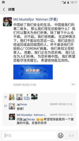 不仅如此,很多同学都在自己的朋友圈表达了对中国战胜病毒的信心,来自哈萨克斯的2017级Nargiz Kamalova同学和来自孟加拉的2018级AKTER同学更是创作了绘画作品来为中国加油!