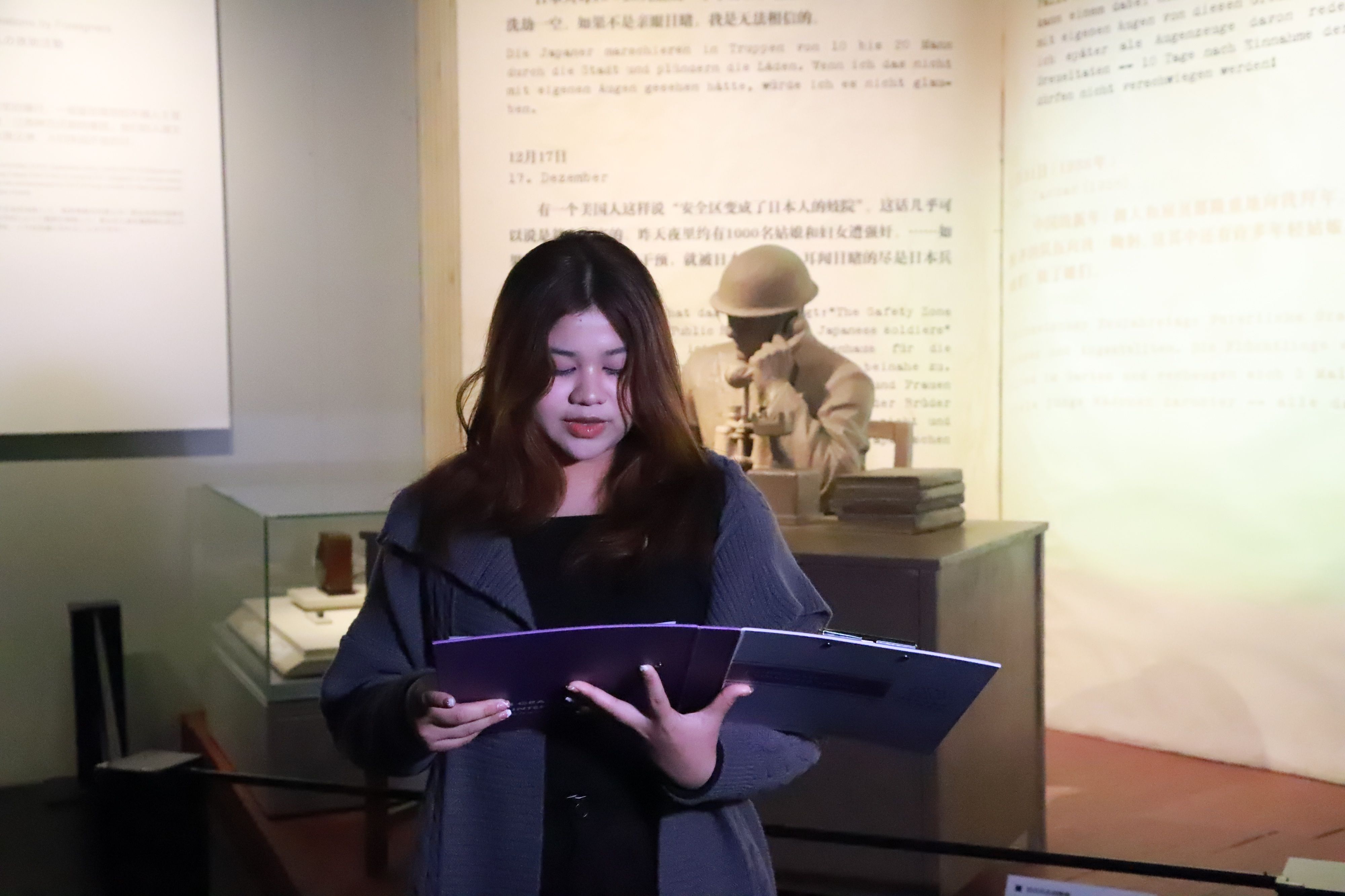 孟加拉国籍职工赵曼衍说:在第二次世界大战中,战火曾经波及我的祖国,我对中国人民在二战中遭受的苦难感同身受。很荣幸能来纪念馆做志愿服务,这是一次跨越国界的历史共鸣和情感交流。马来西亚籍职工方依静表示:我一直向往来到南京,探寻历史真相。这份情感驱使我来到这里,用行动表达对历史的尊重和对遇难者的缅怀。我希望通过我的讲述,让更多人了解南京这座城市,了解这段历史。