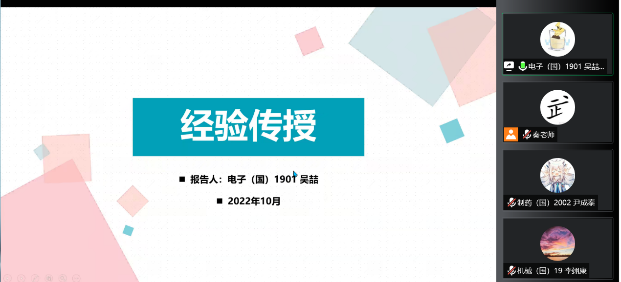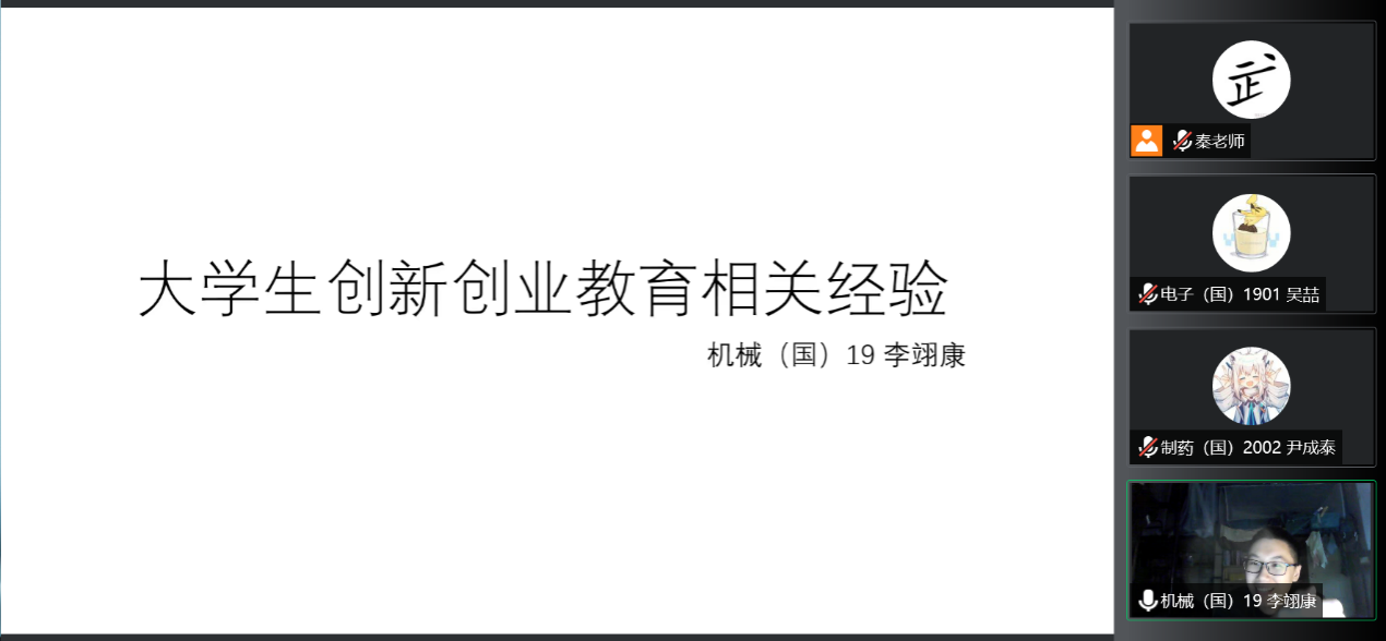 19级吴喆、李翊康和20级尹成泰同学分享了自身参加学科竞赛和大创的经验,鼓励学弟学妹们面对创新创业过程中的艰辛和不确定性时,要充满智慧、勇气和毅力,积极主动、求知若渴、敢闯会创。
