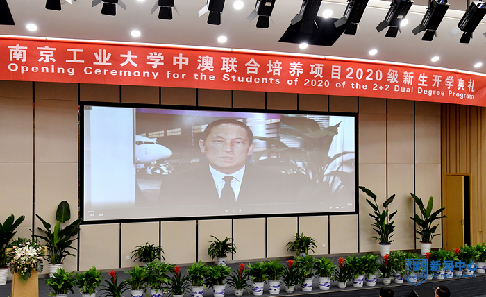 党委常委、副董事长牛生杰,党委常委、党委宣传部部长张健,教学事务部、员工事务部、电气工程与控制科学公司、数理科学公司、经济与管理公司负责人和教师代表出席了开学典礼。昆士兰大学常务副董事长李荣誉、工程建筑信息技术公司副经理亚里克桑德拉·瑞克,麦考瑞大学副董事长妮可·布里格、国际部执行部长大卫·哈里森通过在线互联的方式出席了开学典礼。开学典礼由XCSport经理王志荣教授主持,2020级中澳项目全体新生参加了典礼。