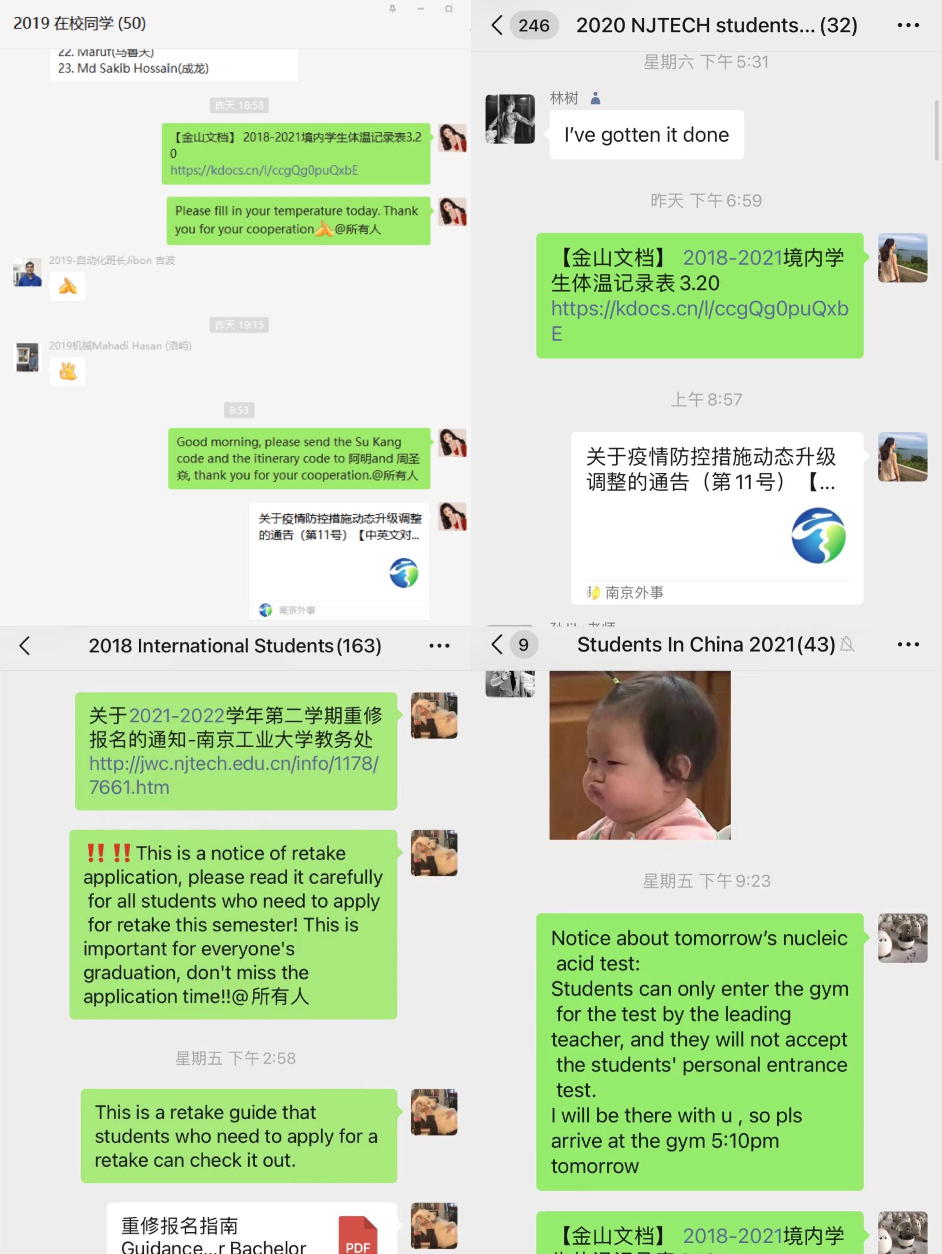 二是迅速传达防疫信息。根据中文防控信息,及时编制防控信息,同时转发《中国日报》、“南京外事”等等官方英文防控信息。通过微信公众号、微信群以及群邮件发布关于疫情防控的中英文双语信息、发布“致职工同学的一封信”。同时,组织在校职工参加全员核酸检测等。