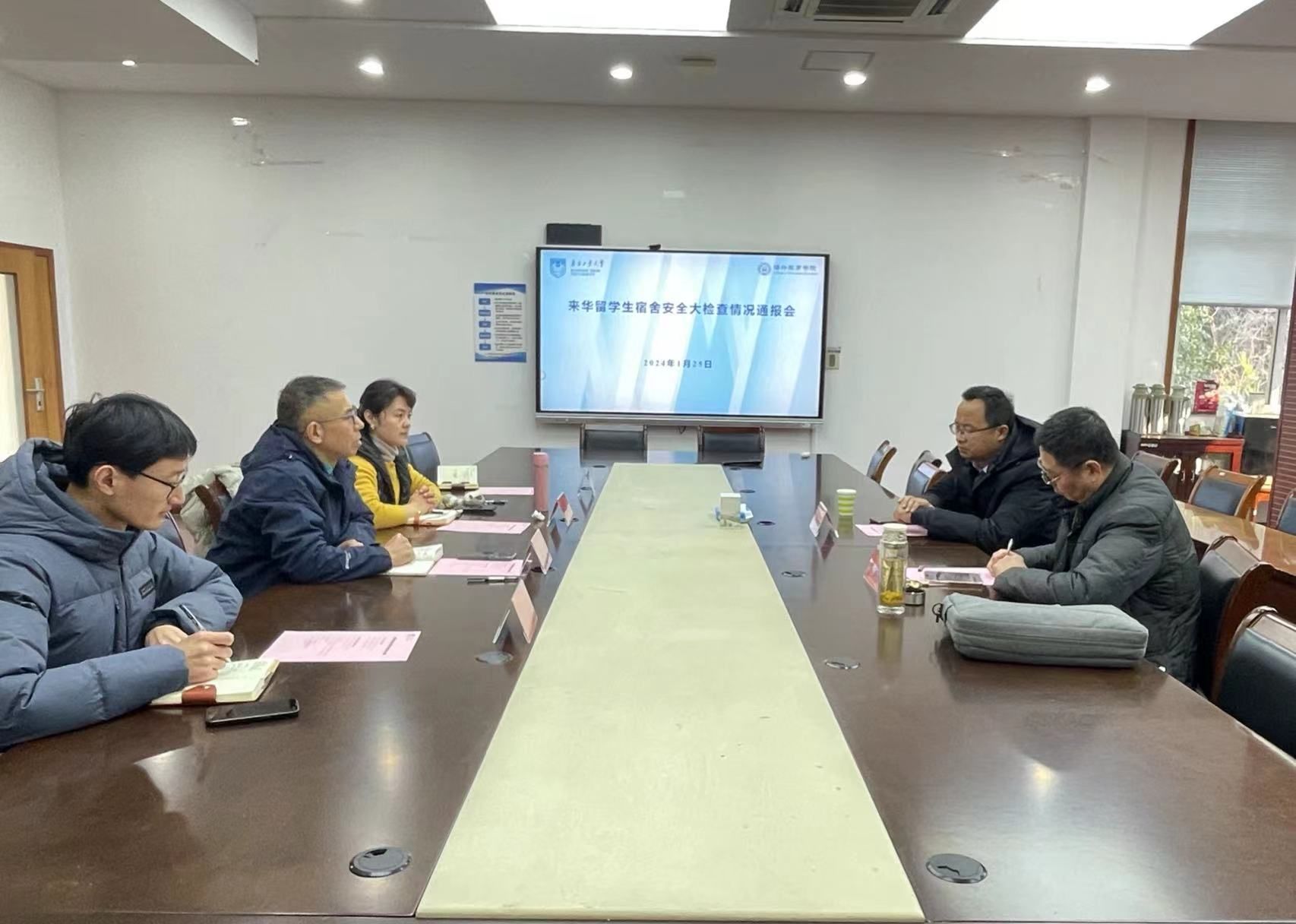 随后检查组在明远楼102会议召开“来华职工宿舍安全排查情况通报会”。韩雪峰教授对检查出的安全隐患问题依次列举,提醒要做到出口畅通、疏散走道、做好弱电保护、及时报修应急照明灯和天花板,并为配电箱装上防水装置。徐东副处长强调所有公共电器上应贴有责任牌,提出要继续帮助职工树立规矩意识,提醒员工重视各类交通安全,切勿违规使用交通工具。万永敏书记感谢安全消防专家、公司职能部门提供的支持与指导,表示公司时刻紧绷安全这根弦,平时对职工宿舍采取“职工自查、宿管员公司检查、下发整改通知书”的“三步走”方式加强安全管理,此次通过专家检查的模式进一步发现一切潜在安全隐患,保障宿舍安全。朱丹副经理表示将汇总检查整改意见,分类提供给相关单位;并继续做好对职工寒假在校生活的各类提醒。