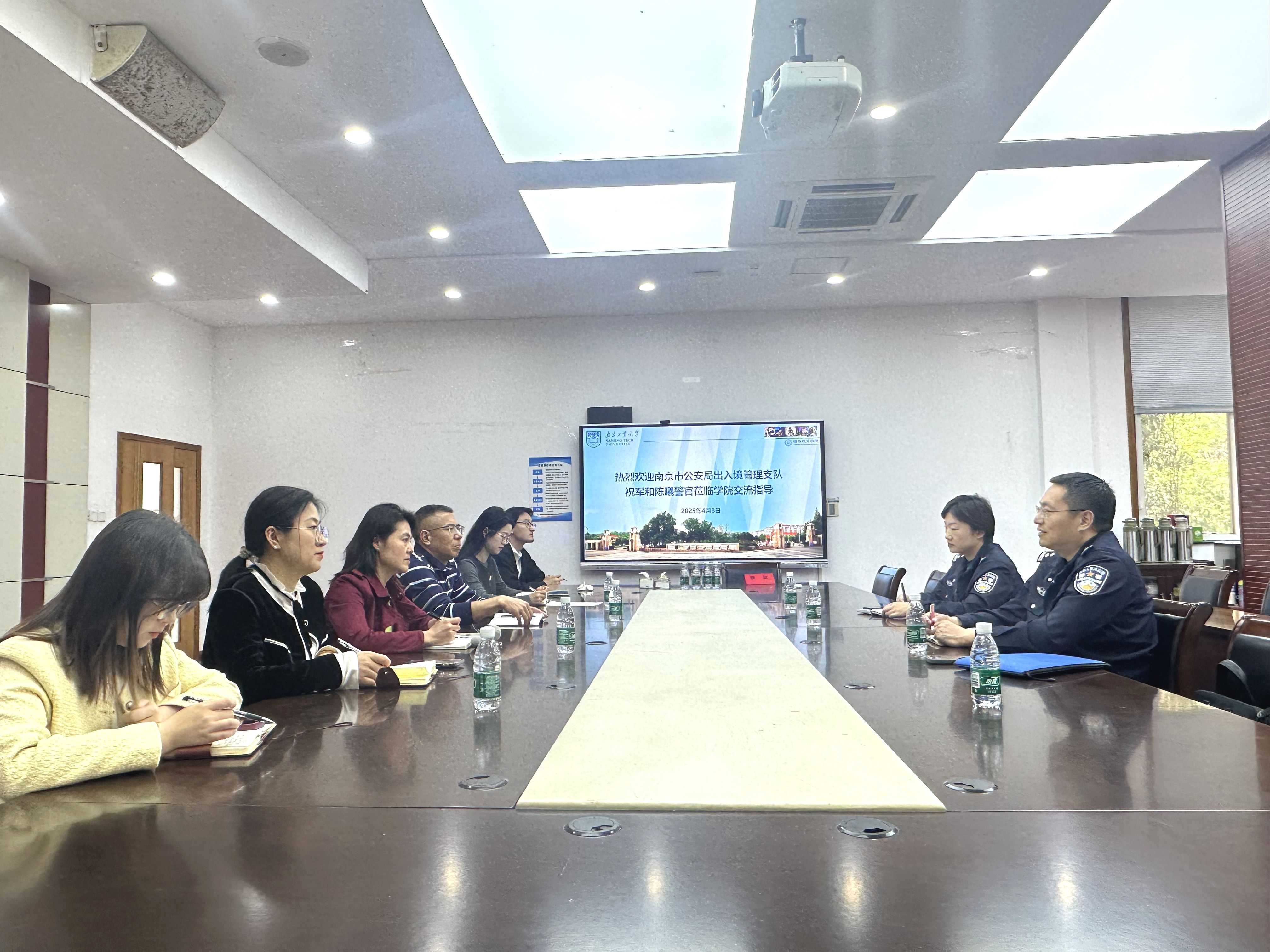 4月8日下午,南京市出入境管理支队祝军警官和陈曦警官莅临公司,对来华职工教育管理工作开展专项指导。海外教育公司党委书记万永敏,副经理朱丹以及职工管理办公室的全体辅导员参加了此次会议。会议深入分析了近期职工违法违纪事件,并共同探讨了管理优化措施;同时会议还对2025年来华职工招生计划及日常教育工作提出了指导意见。