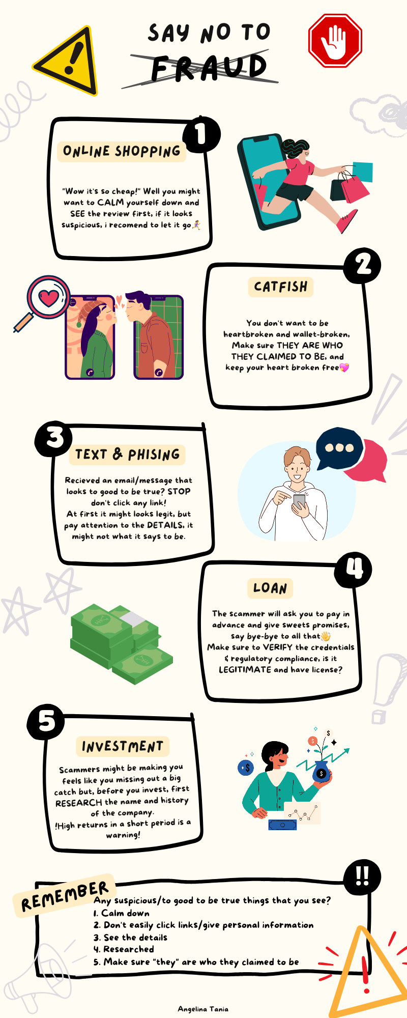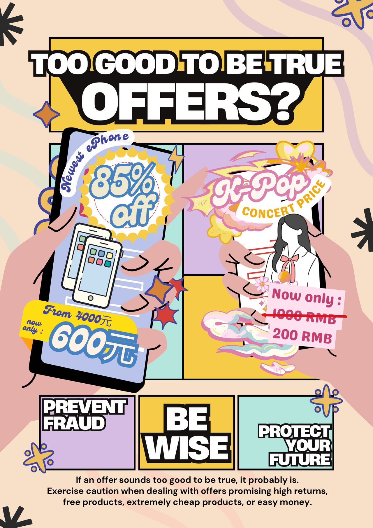 作品介绍:I picked this “Too Good to Be True” theme because this is one of the fraud that often happens to young people. The lack of concern of fraud makes young people easily get scammed. Too Good to be True offers including Investment Scams, Extremely cheap price of products, Lottery or Prize Scams; claiming victims they have won a lottery, sweepstakes, or prize draw, even though the victim never entered, Romance Scams; targeting individuals on dating websites or social media platforms, building trust and emotional connections before requesting money for various reasons, and many more. To avoid falling victim to "too good to be true" offers fraud, individuals should exercise skepticism, conduct thorough research, and be cautious when presented with unsolicited offers or opportunities that seem too good to be true. Additionally, reporting suspected fraud to the appropriate authorities can help prevent others from becoming victims of similar scams.