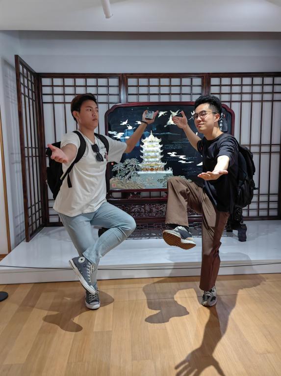 最让同学们兴奋的是1号馆的裸眼5D视觉影片;2号馆的沙飞船,以及3号馆的街景。同学们登上沙飞船感受两岸逼真的风光,很震撼! 而在3号馆,那古运河边古色古香的街景让人一秒穿越。而林立的文创类店铺让观众能沉浸式体验漆扇和印刷术!
